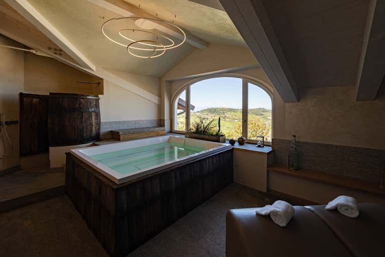 Take part in our taste and wellness experience in Monforte d'Alba: the package includes a wellness path in the spa enriched with grape-based cosmetics, followed by a guided tour of the winery and wine tasting.