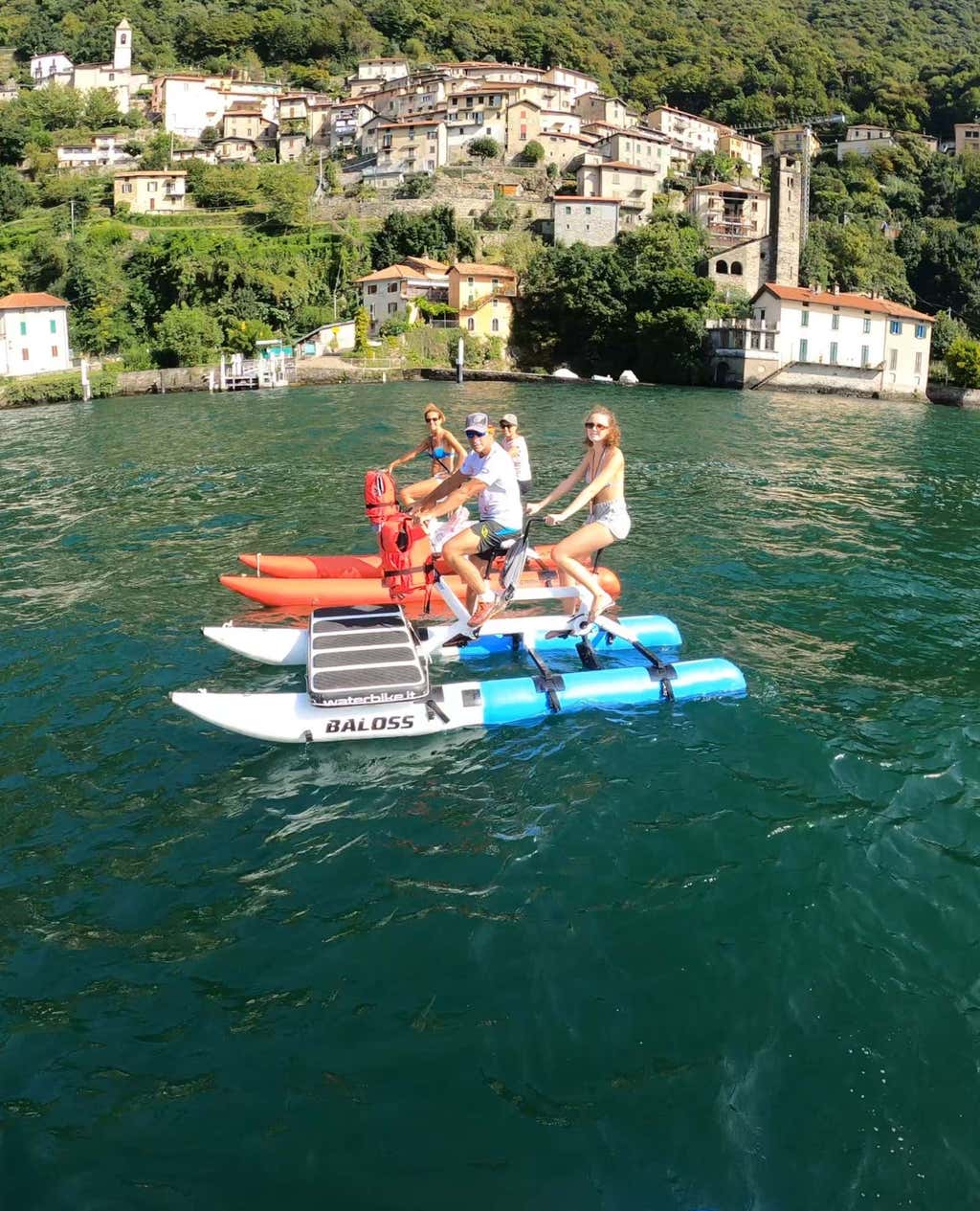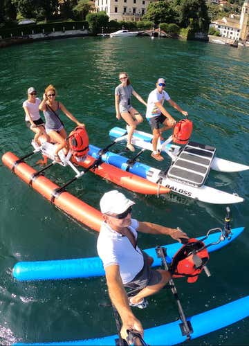 The waterbike tour lasts approximately 2 hours and starts from the Laglio office, a stone's throw from the flat. Here we will meet the guide who will provide us with everything we need for the experience: waterbike and life jacket. After the briefing. .. we get in the saddle! You will cycle past Villa Oleandra, George Clooney's residence, and then follow the coastline dotted with elegant historic villas to the village of Torriggia. You will then cross the lake to reach Careno and then the Orrido di Nesso, where a spectacular waterfall plunges between two rock walls directly into the lake. During the approximately 10 km route, you can make short scenic stops or, why not, take a refreshing dip.