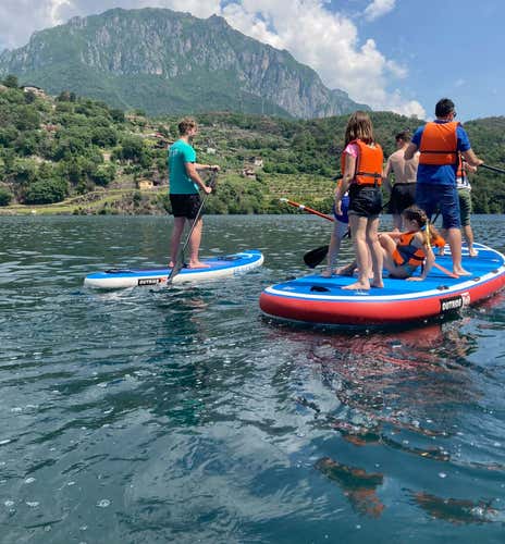 - SUP paddling on the calm waters of Lake Moro in Val Camonica
