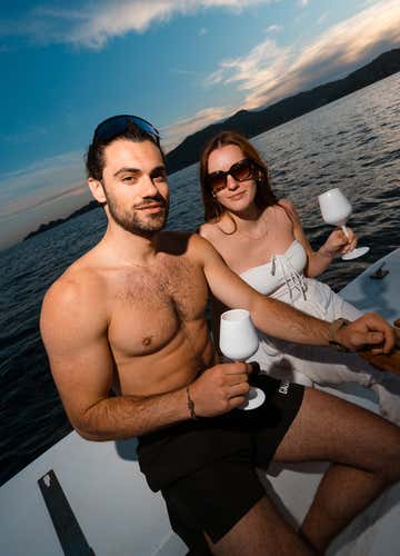 Under the light of a romantic sunset, we will enjoy a tasty aperitif on board the catamaran: in a delicious wicker basket, a focaccia platter and some typical Ligurian products washed down with white wine or prosecco will be the best way to end our tour.