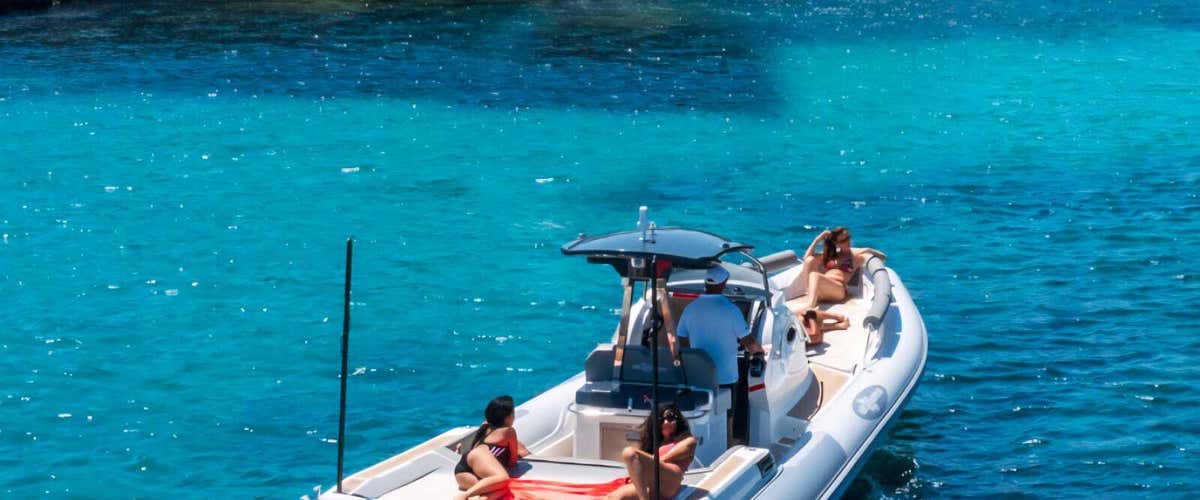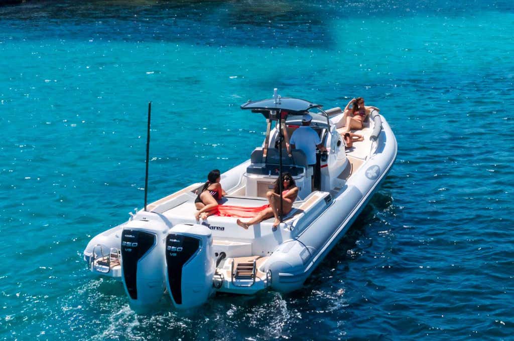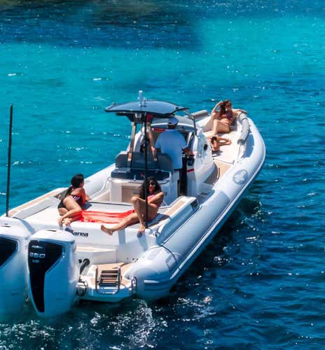 - 9-metre dinghy Altamarea Wave 27 for a maximum of 10 participants, equipped with 250 hp engine, removable awning, bluetooth stereo, minibar and shower.