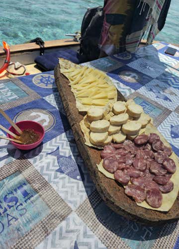 Once back on the boat, an aperitif of local products (sausage, cheese, jams...) will be waiting for us. Afterwards, a first seafood dish will be served, accompanied by water, soft drinks, local vermentino wine , and coffee.