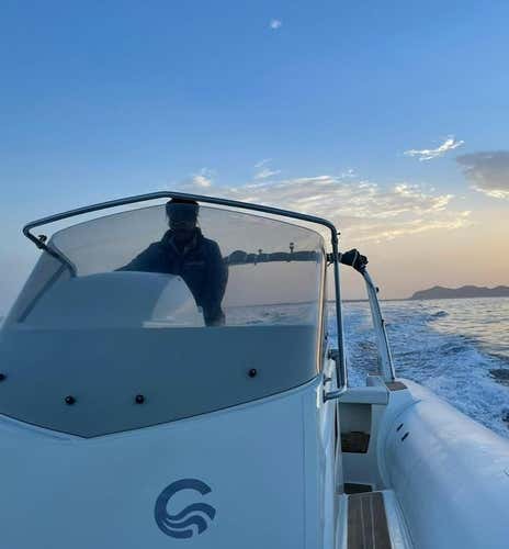 Theboat can be chosen at the time of booking between an 8-metre long or 10-metre long dinghy, depending on one's needs and preferences for space; both are equipped with awning and freshwater shower.