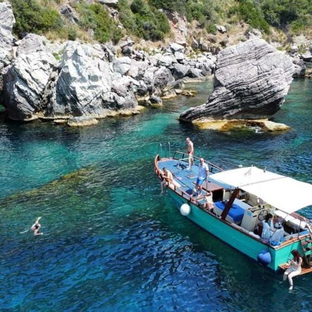 Theboat is a 10-metre-long wooden gozzo, equipped with a sun deck at the bow, a small beach at the stern, an awning, a shower, a climbing ladder and a toilet. It is preferable to remain barefoot on board and to hand in one's shoes at the embarkation point. Dogs are not allowed on board.
