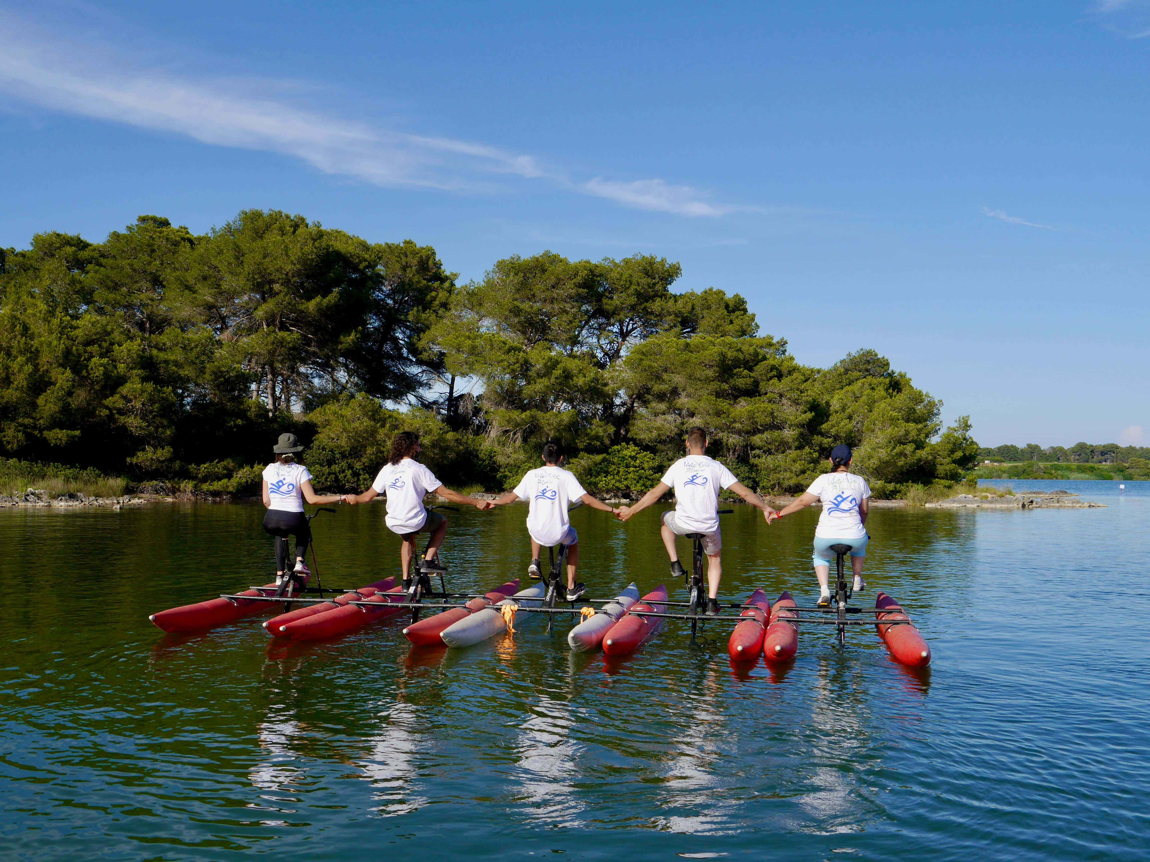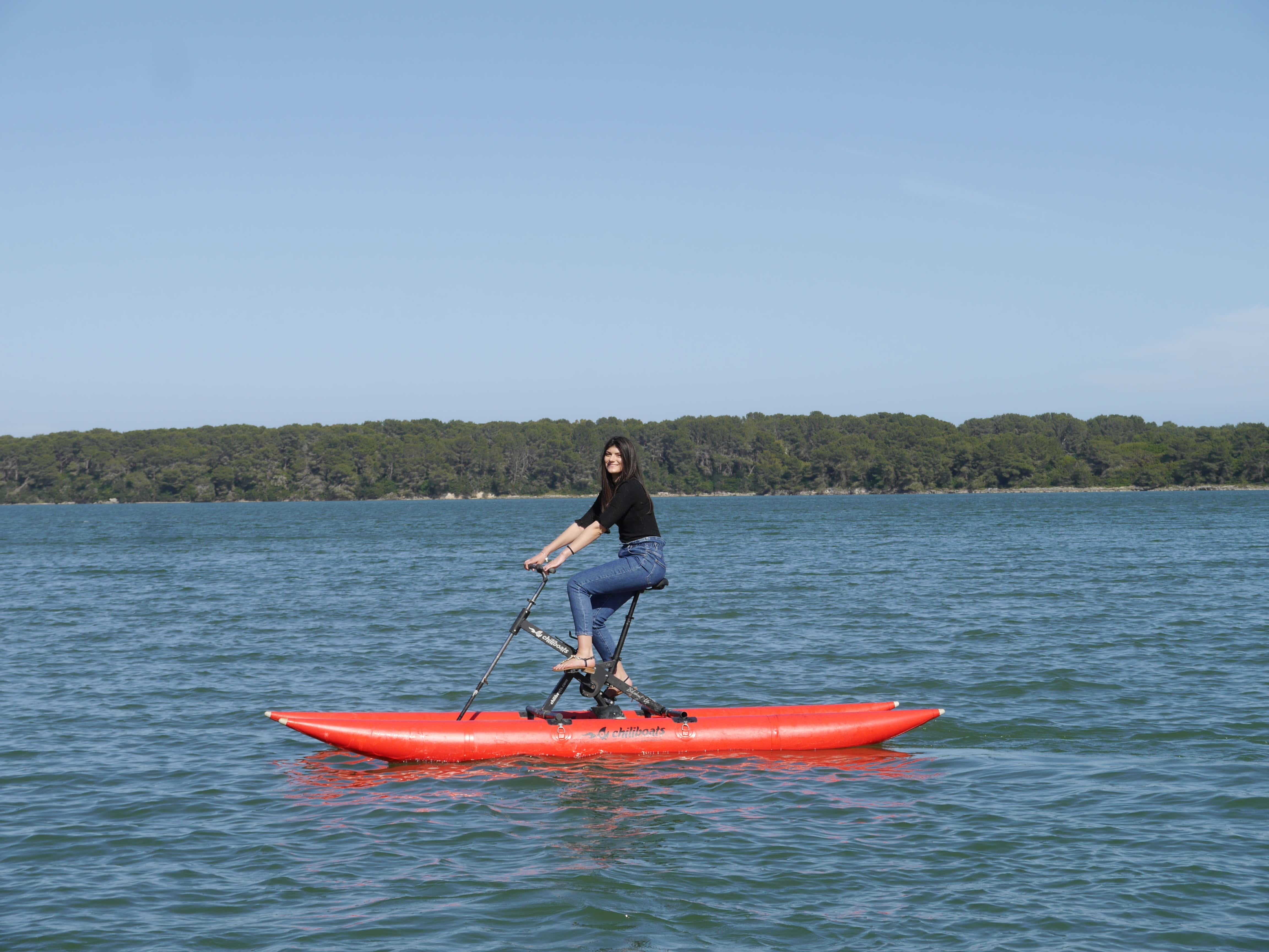 Via a small jetty we will be able to easily get on our water bikes, a practical means of transport where, instead of wheels, the frame rests on two floats which allow us to pedal on the water. After an initial briefing, we will stay for the first 10 minutes near the shore to get familiar with the water bikes.