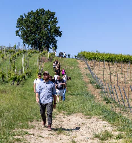 At the end of the guided experience, we will receive our cooled picnic bag containing 1 sandwich with roast beef, grana cheese and salad; 1 sandwich with Varzi PDO salami; 1 home-made pie; 1 0.5 l bottle of water; 1 0.75 l bottle of wine for every 2 or 3 adults ("Columban", Province of Pavia IGT Pinot Nero vinified in sparkling white); except for the bottle of wine, the contents are per person. With our bag in hand, we can then head to the vineyard and sit among the rows of vines, where we will spread out our picnic blanket and enjoy the homemade products.