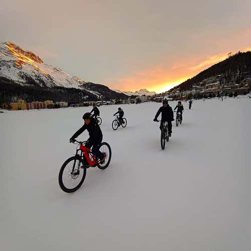 Experience a unique ride on a frozen lake in the Engadin valley in Switzerland. With studded e-bikes you will ride along snowy tracks and experience the thrill of crossing a sheet of ice. It will be a unique thrill and the spectacular landscape of the Swiss Alps will be all around you. Get ready to saddle up!