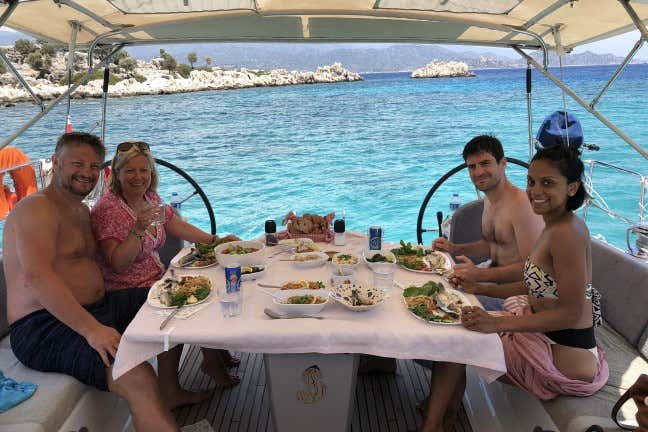 The only drawback that couldn't be solved: there was no wind and therefore no sail. But everything, everything went more than fine, great skipper Can for navigation, for snorkelling stops, for aperitifs and lunch on board. All super!!!!