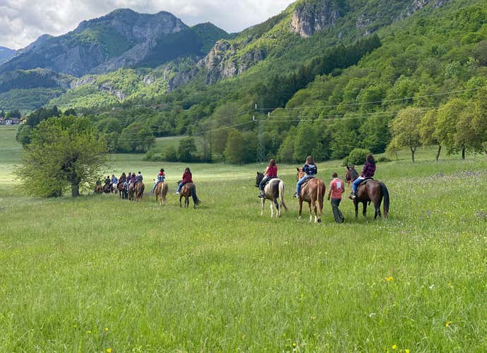 Discover the unspoilt nature of the Piana di Demonte, in the heart of the Piedmontese Alps, on a 2-hour horseback ride. Along the easy 8 km route, you will immerse yourself in the fields and green meadows of the plain as far as the Stura River. Once back at the stables, a tasty aperitif with cold cuts and alcoholic and non-alcoholic drinks will be waiting for you.