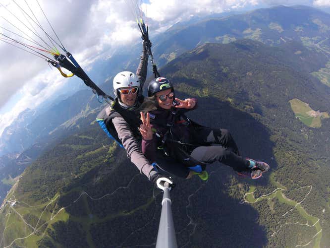 Experience the thrill of free paragliding at Campo Tures, in the province of Bolzano. In tandem with a professional pilot, you will fly over the middle Valpusteria valley, enjoying the incredible view. During the 15-minute flight you will experience unique sensations of freedom and lightness, letting yourself be pushed by the ascending currents through the blue sky and the beautiful landscape of the Valpusteria valley.