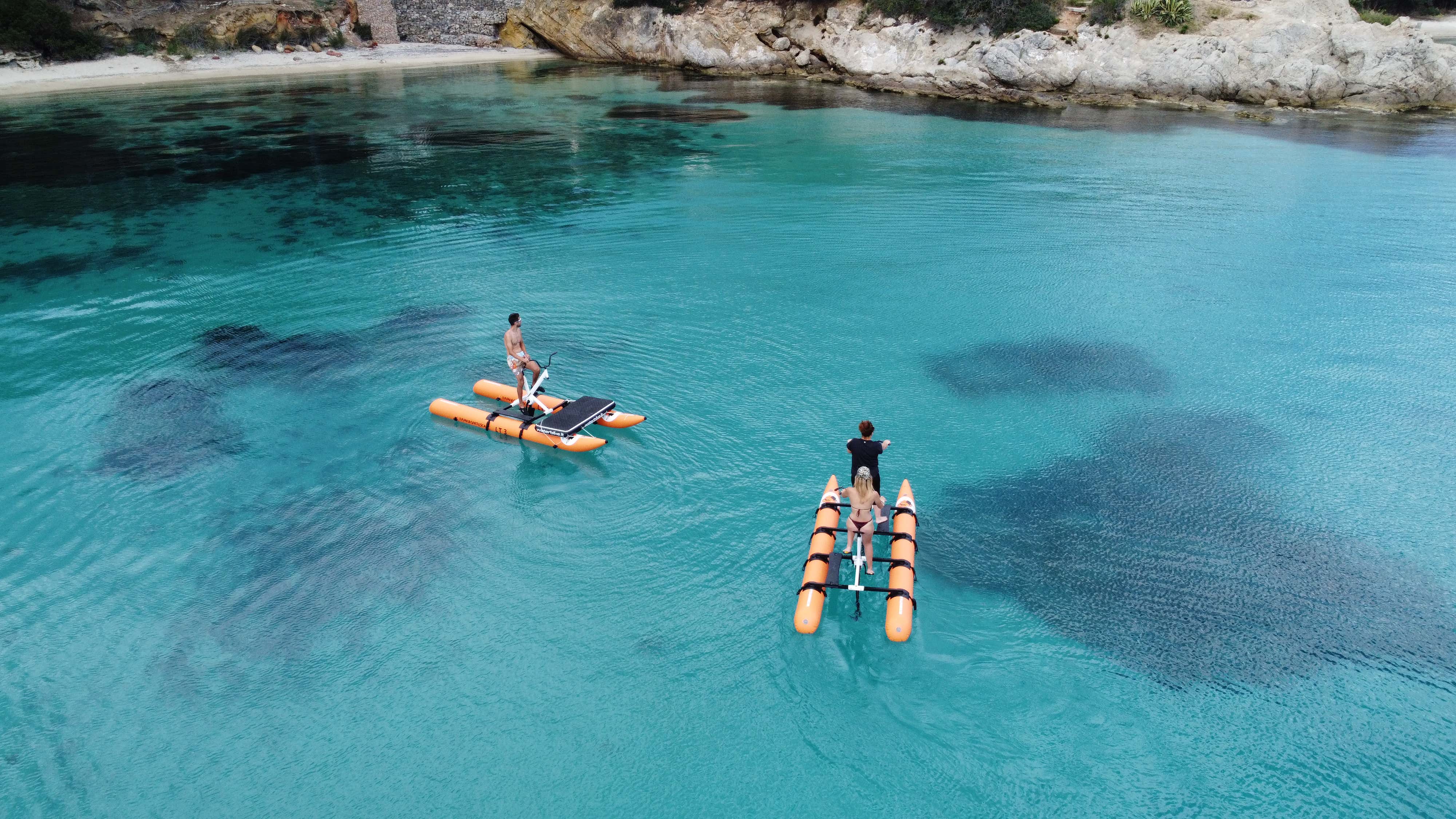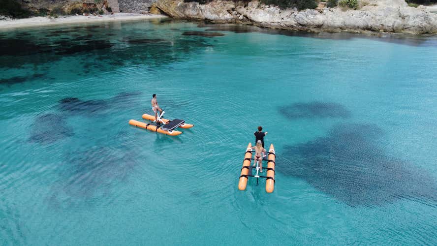 Partecipa a un'escursione in waterbike a Golfo Aranci: seguito da un istruttore, ti avventurerai nella splendida cornice naturale tra Cala Moresca e l'Isola di Figarolo. Ti fermerai in questo scenario per una sosta aperitivo e una sosta snorkeling guidata da un biologo marino, alla ricerca di simpatici delfini. Un'esperienza di oltre 2 ore, "pedalando sull'acqua"!